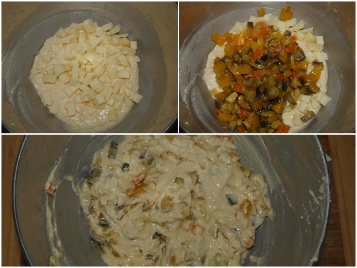 Aggiungere ora all'impasto le verdure e il formaggio tagliato a cubetti