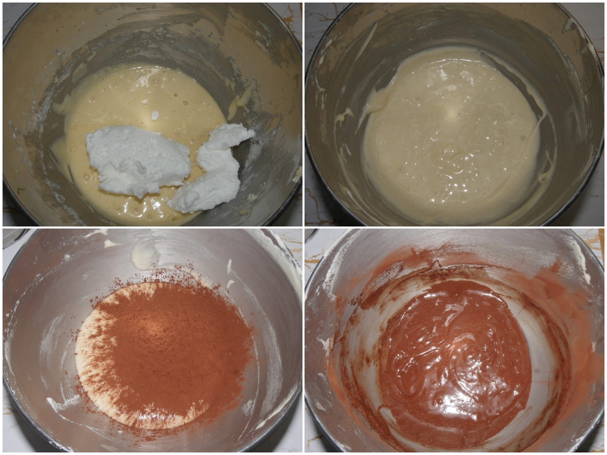Mescolando delicatamente con una spatola, incorporate prima gli albumi, quindi dividete il composto in 2 ciotole e unite da una parte la vaniglia e dall'altra il cacao setacciato e, se vi dovesse sembrare troppo denso rispetto all'altro, anche 2-3 cucchiai di latte, 1 per volta.