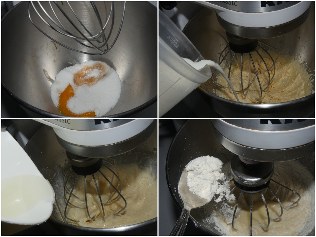A parte, montate i tuorli con lo zucchero per almeno 10 minuti, fino ad ottenere un composto chiaro e spumoso, quindi, continuando a montare, incorporate a filo prima l'olio e poi anche il latte e infine la farina setacciata, poco per volta.