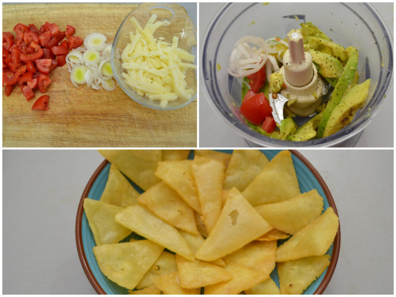 Preparate ora il guacamole e tagliuzzate i pomodori, il porro e il formaggio. Ponete i nachos in un piatto da portata.