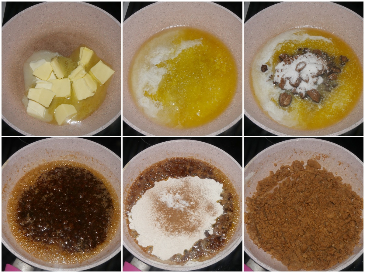 Innanzitutto preparate il crumble: fate sciogiere il burro a tocchetti in una padella antiaderente, quindi unite zucchero e zucchero di canna e lasciateli sciogliere, infine incorporate anche farina, sale e cannella, mescolando subito.