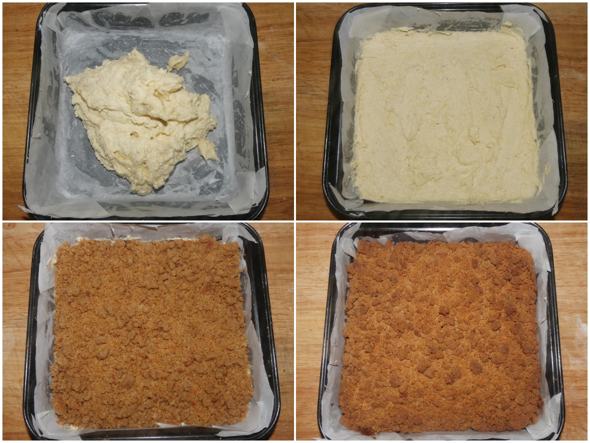 Versate il composto nello stampo rivestito di carta forno e livellate la superficie, quindi ricoprite con il crumble e cuocete per 40-45 minuti in forno statico preriscaldato a 170°C.
