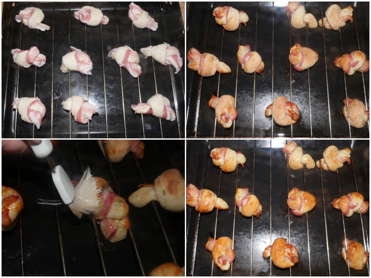 Disponete 1 fetta di bacon su ogni striscia e annodate per formare un nodino.