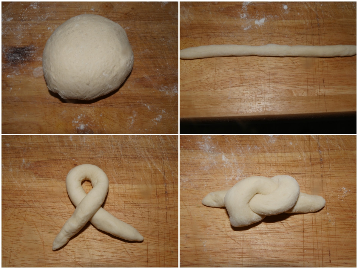 Riprendete l'impasto, sgonfiatelo aiutandovi con un po' di farina, poi prendetene un po' per volta e formate dei cordoncini lunghi circa 15 cm, quindi annodateli per creare i nodini.