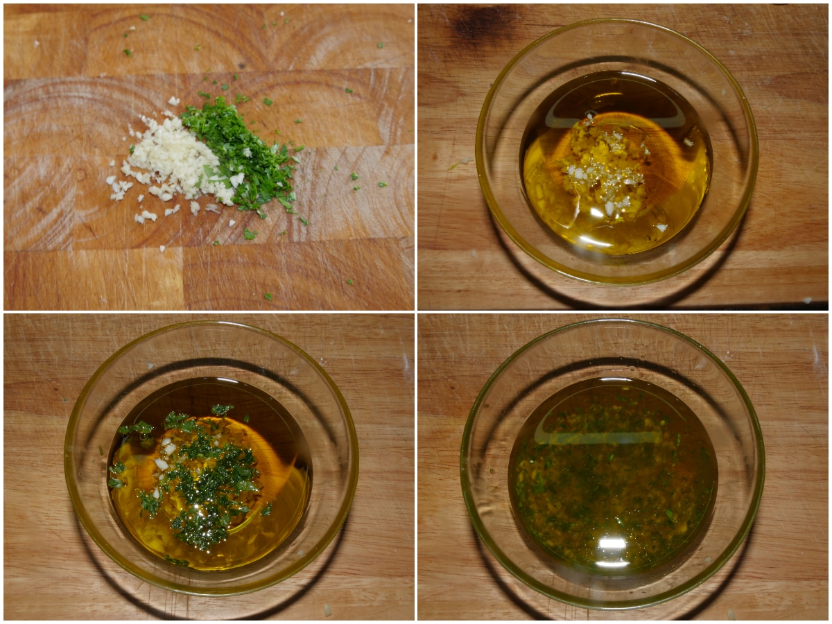 Innanzitutto preparate l'olio aromatico: tritate molto finemente aglio e prezzemolo e uniteli all'olio leggermente scaldato, in una ciotola piuttosto ampia.
