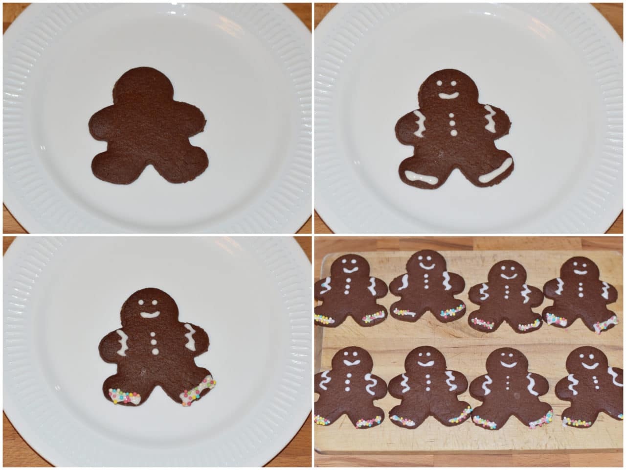 Mettete la glassa in una sac-à-poche dal beccuccio liscio e molto sottile e decorate a piacere i vostri omini, usando anche gli zuccherini, infine lasciate riposare ancora per almeno 7-8 ore.