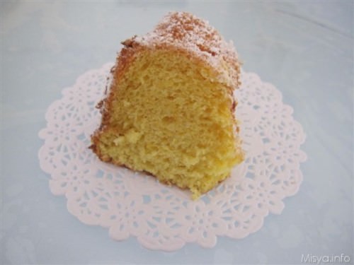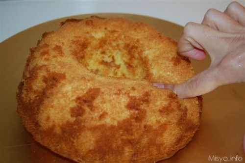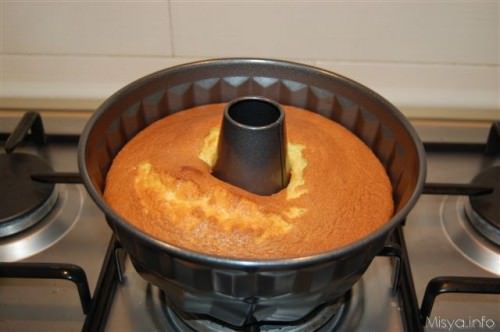 Quando la torta sarà completamente raffreddata, con l'aiuto di una spatola staccarla dalle pareti dello stampo quindi capovolgerla su un piatto da portata. (Da notare l'effetto spugnetta della ciambella che ritorna nella sua posizione dopo averla schiacciata)