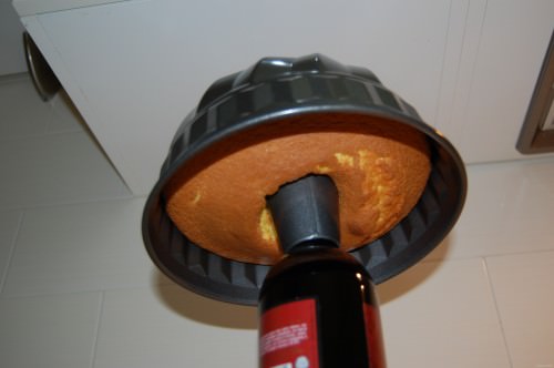 Togliete lo stampo dal forno e capovolgerlo immediatamente sul collo di una bottiglia a farlo raffreddare ( in questo modo la torta non tenderà ad afflosciarsi)