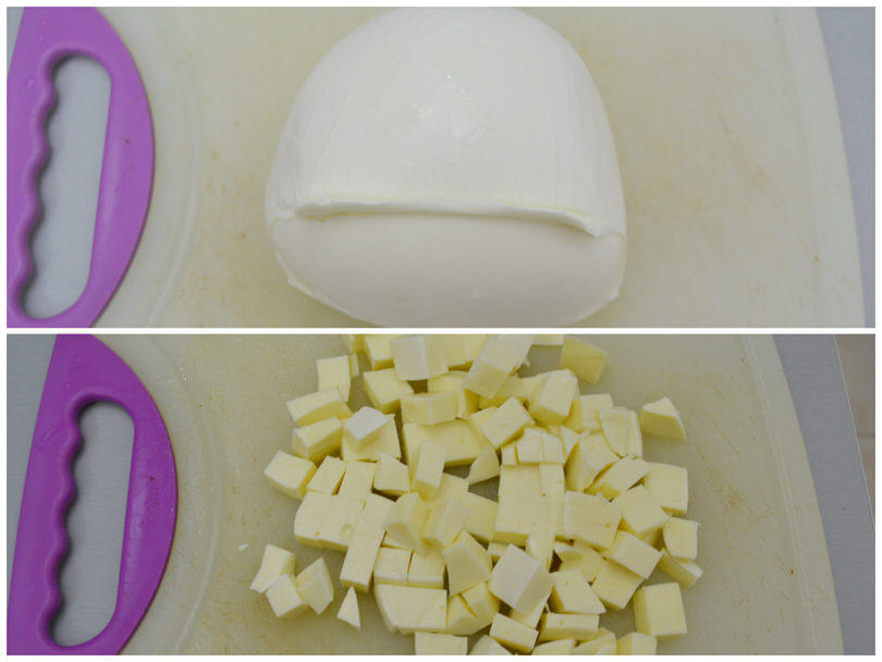 Innanzitutto tagliate la mozzarella a dadini e lasciatela scolare in un colino.