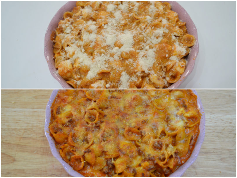 Mettete il tutto in una teglia, livellate la superficie, spolverizzate col restante parmigiano e cuocete in forno ventilato già caldo a 180°C per circa 25-30 minuti.