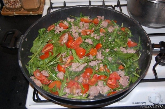 Aggiungere ora i pomodorini e la rucola, salare e mescolare delicatamente e far cuocere un paio di minuti.