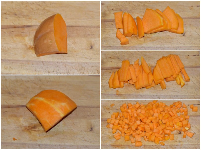 Mondate la zucca e tagliatela a cubettini.
