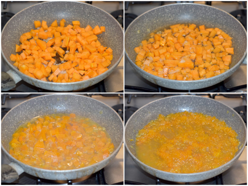 Unite anche la zucca e lasciatela insaporire, poi coprite col brodo e portate a cottura e schiacciate con una forchetta.