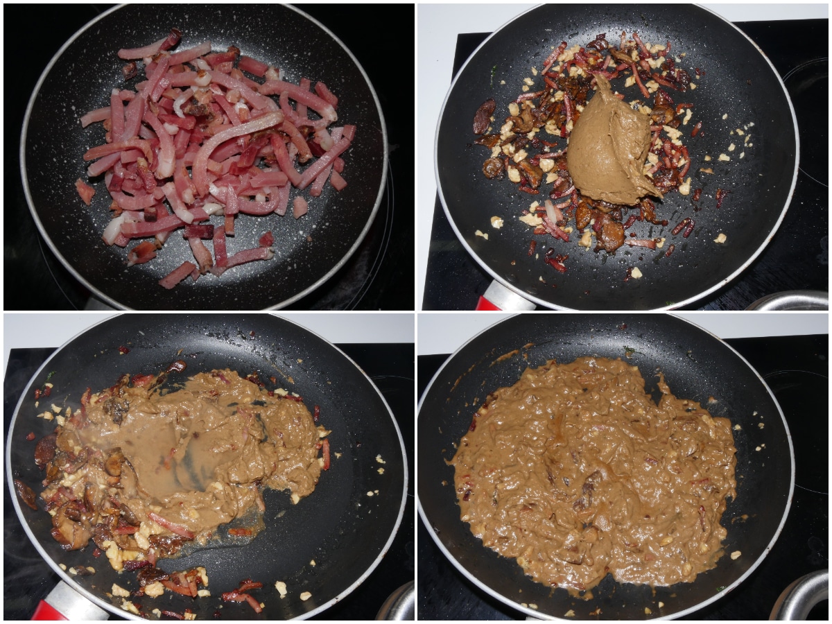 Nella stessa padella, fate rosolare lo speck, quindi toglietene un pochino (lo userete per decorare i piatti) e aggiungete le noci spezzettate grossolanamente, la crema di funghi e un pochino di acqua di cottura della pasta per rendere il tutto più cremoso.