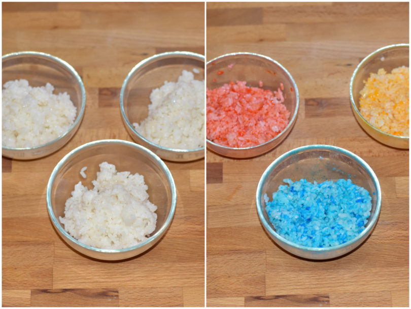 Dividetelo in 3 ciotoline e unite una polvere diversa (curcuma, spirulina, barbabietola) a ognuna di essa, in modo da colorarlo.