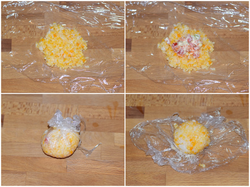 Appoggiate un foglio di pellicola per alimenti sul piano di lavoro, disponeteci sopra una noce di riso, appiattitela e mettete al centro un po' di farcitura, quindi aiutandovi con la pellicola richiudete il riso sul ripieno.