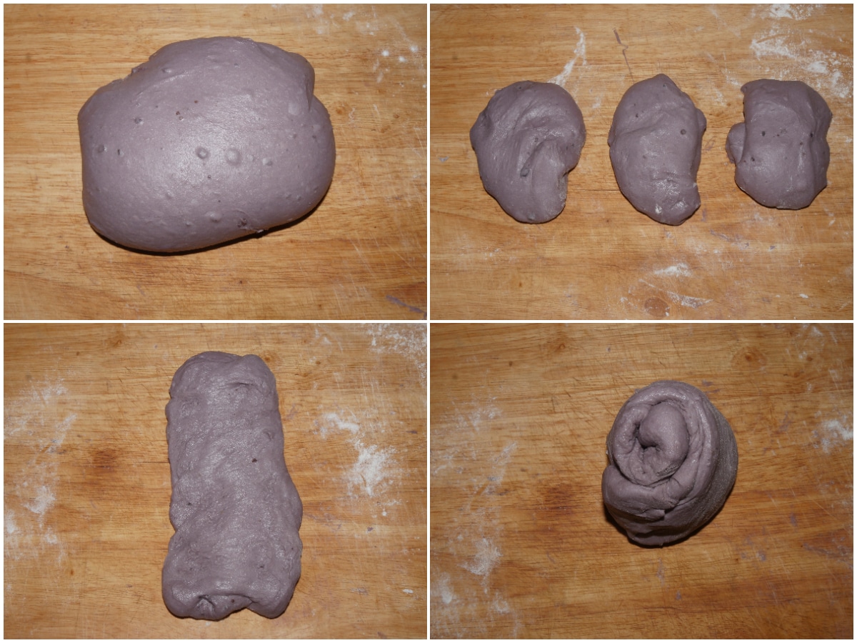 Riprendete l'impasto, sgonfiatelo con le mani e dividetelo in 3 parti uguali, quindi prendetene 1 per volta, schiacciatela dandole una forma allungata e arrotolatela su se stessa dal lato corto, come a voler creare un cilindro.