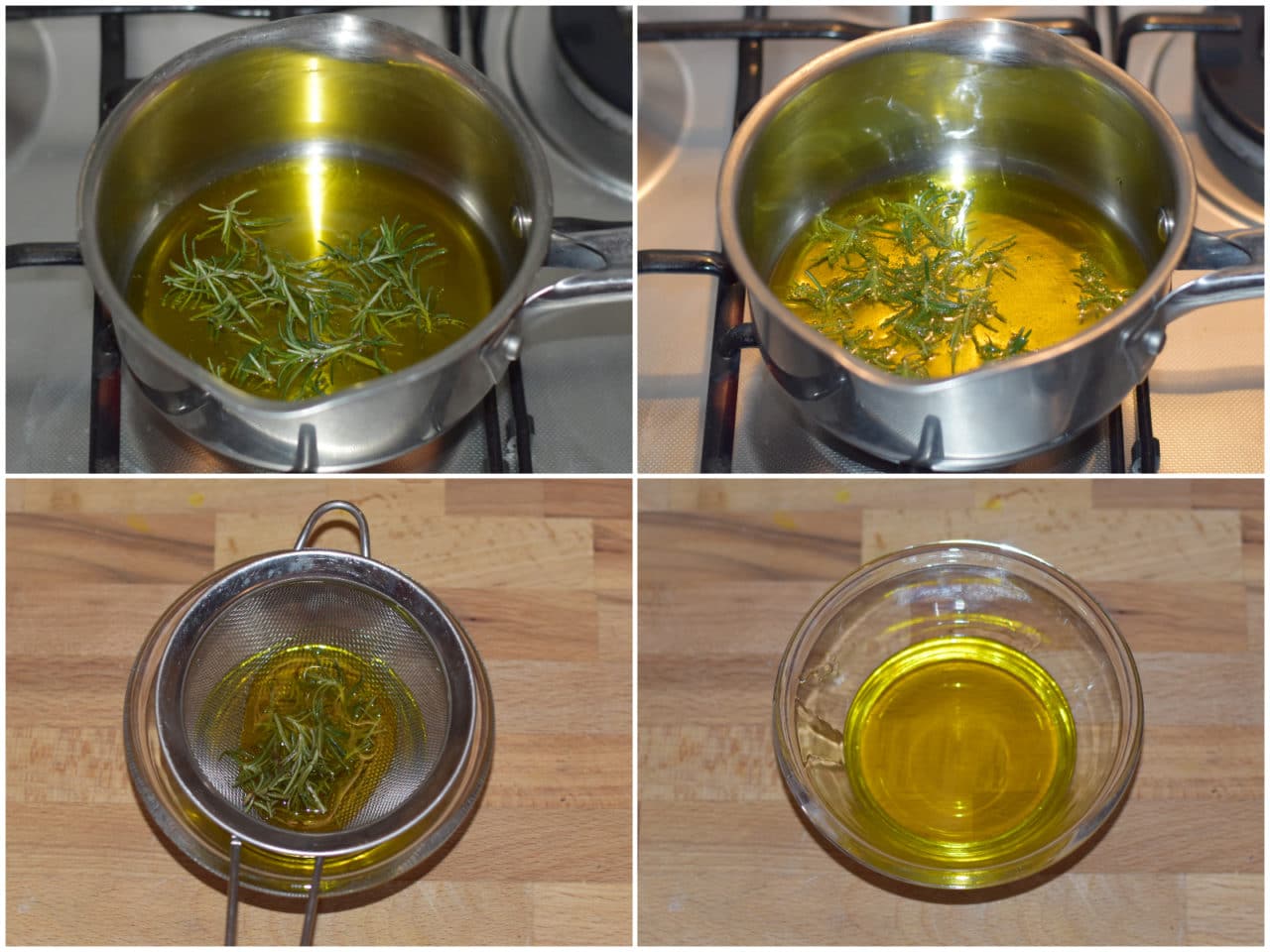 Nel frattempo mettete olio e rosmarino in un pentolino e iniziate a scaldare, spegnendo non appena l'olio inizierà a sfrigolare.