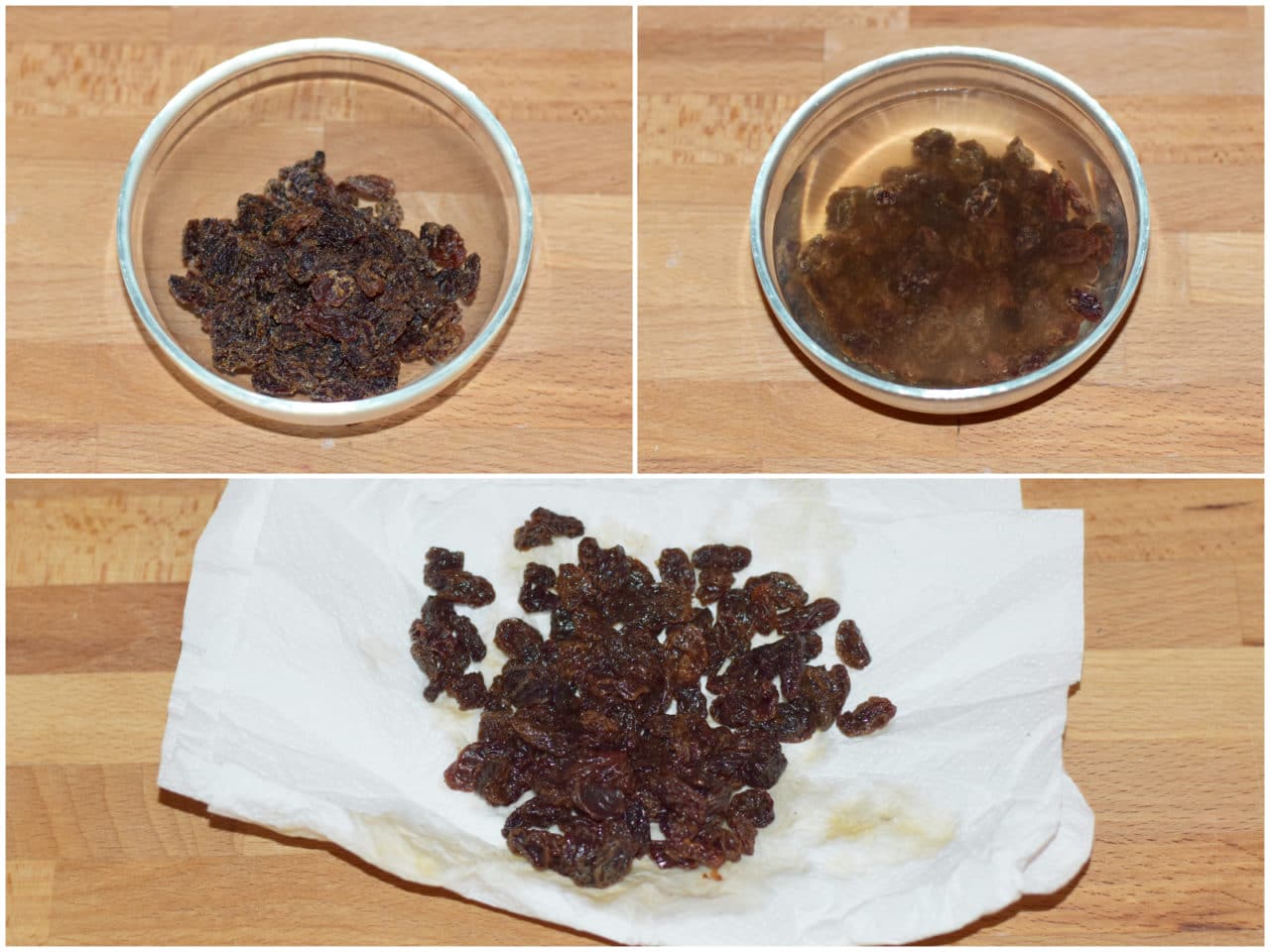Nel frattempo mettete l'uvetta a bagno in acqua calda per almeno 10 minuti, poi scolatela, strizzatela leggermente e tamponatela delicatamente con carta da cucina.