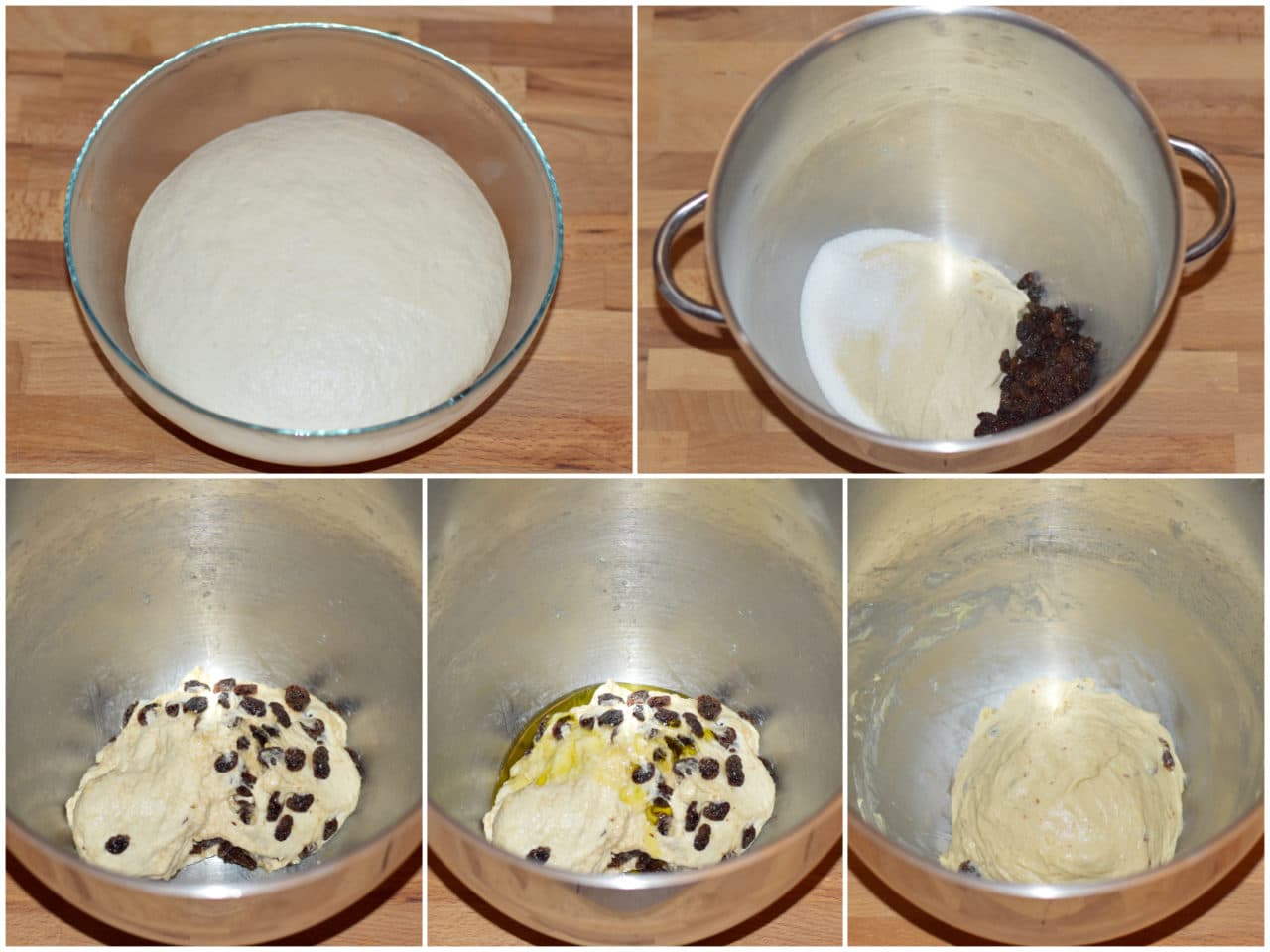 Riprendete l'impasto, unite zucchero e uvetta e iniziate a impastare, quindi aggiungete anche l'olio e continuate a lavorare per almeno 10 minuti.