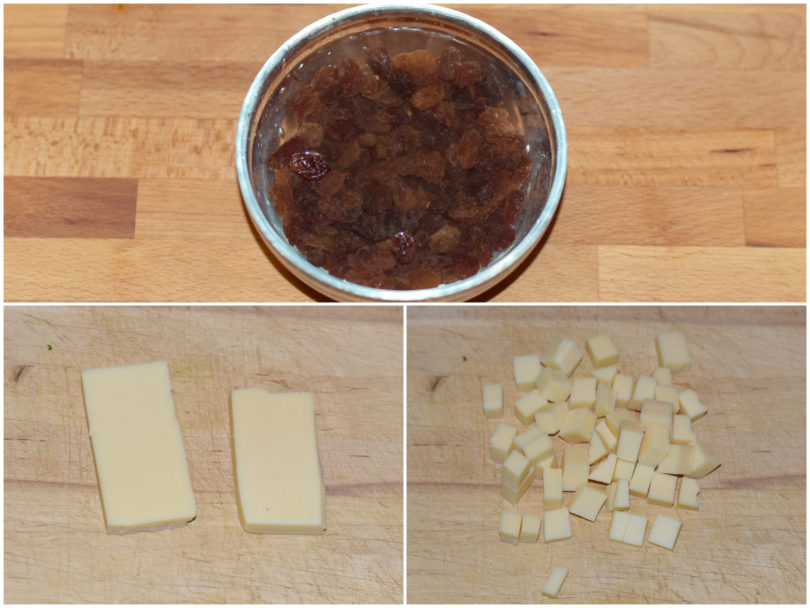Nel frattempo preparate la farcitura: tritate grossolanamente le noci, tagliate a cubetti il pecorino, mettete l'uvetta in ammollo in acqua tiepido-calda (dovrà restarci per almeno 10 minuti).