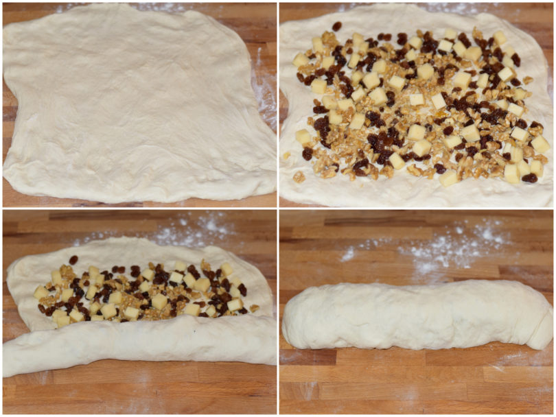 Cospargetelo uniformemente con uvetta (dopo averla scolata e strizzata delicatamente), noci e formaggio, quindi arrotolate la sfoglia sul ripieno fino ad ottenere un filone, che lascerete riposare per 1 oretta, sempre coperto con pellicola.