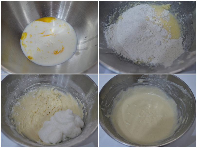 Aggiungete farina, sale e lievito al composto di latte e mescolate, infine incorporate anche gli albumi, mescolando piano e dal basso verso l'alto, in modo da non farli smontare.