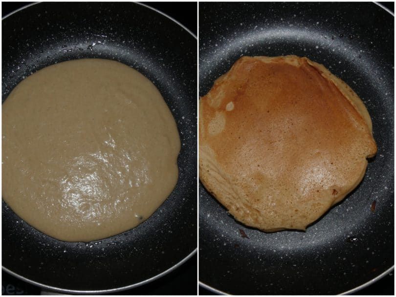 Cuocete i pancake 1 mestolino per volta su una padella antiaderente già calda, leggermente unta con un fiocchetto di burro.