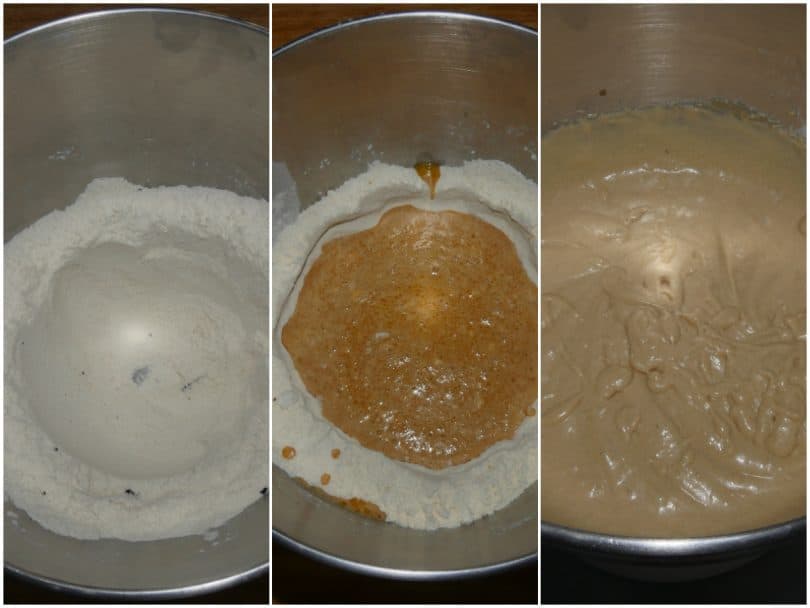mettete in una ciotola farina, zucchero e lievito e mescolate, poi versate al centro le uova sbattute con latte, burro fuso, caffè e vaniglia e amalgamate bene.