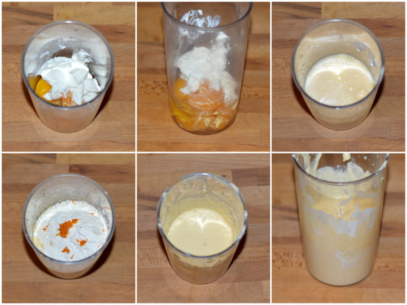 Aggiungete anche farina, lievito, zucchero e buccia di arancia grattugiata e frullate ancora.