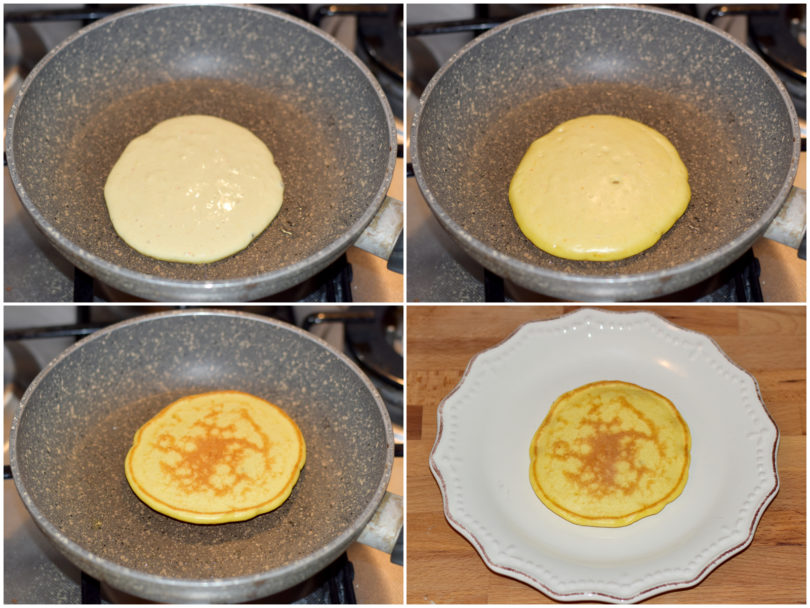 Fate scaldare una padella antiaderente, ungetela con poco olio di semi e cuocete la pastella a cucchiaiate a fiamma media: quando sulla superficie iniziano a comparire bollicine, capovolgete i pancake con una spatola per far cuocere anche il secondo lato.