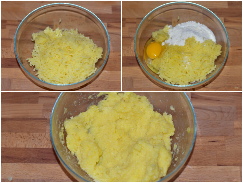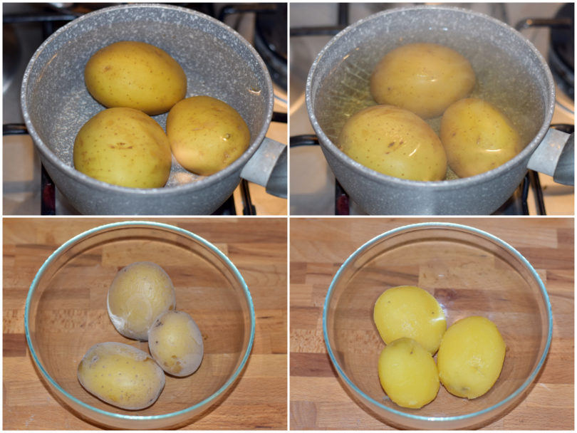 Lavate bene le patate, mettetele in una pentola capiente, coprite con acqua abbondante e cuocete per circa 35 minuti o fin quando non risulteranno ben cotte, quindi pelatele e schiacciatele.