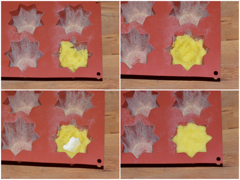 Mettete un po' di composto sul fondo, pressando bene, create un foro al centro, aggiungete la provola e chiudete con altre patate, livellando bene la superficie.