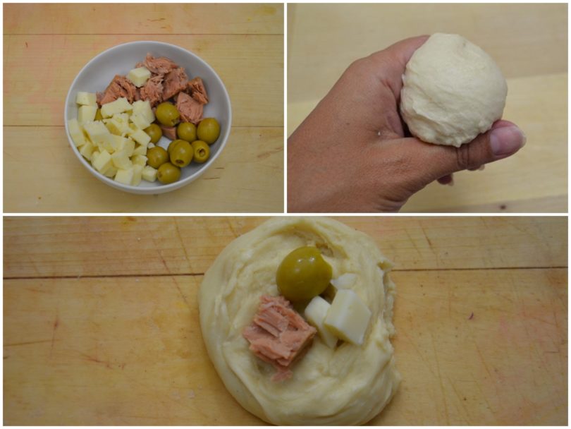 Dividete quindi l'impasto in 6 palline, appiattitele, aggiungete la farcitura al centro e richiudete bene formando una pallina.