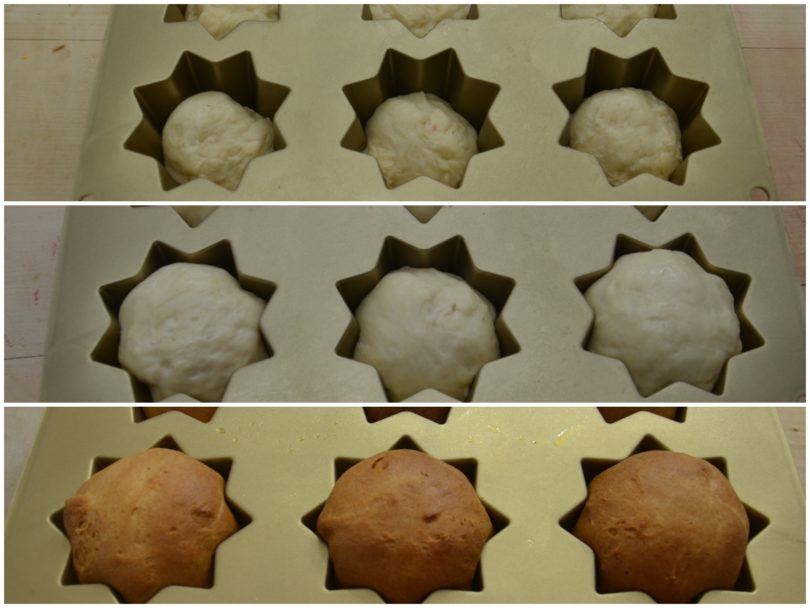 Man mano che sono pronte, riponete ogni pallina in uno stampino ben imburrato, quindi lasciate lievitare nuovamente per circa 1 ora, o comunque almeno finché l'impasto non avrà raggiunto la superficie degli stampini.