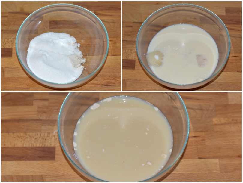 Versate in una ciotola zucchero, lievito, vaniglia e latte e mescolate fino a far sciogliere tutto.