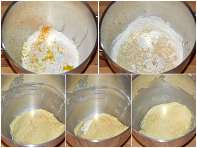 Disponete farina, curcuma, sale e buccia di agrumi nella ciotola della planetaria e mescolate, quindi incorporate il composto di latte mentre iniziate a impastare.