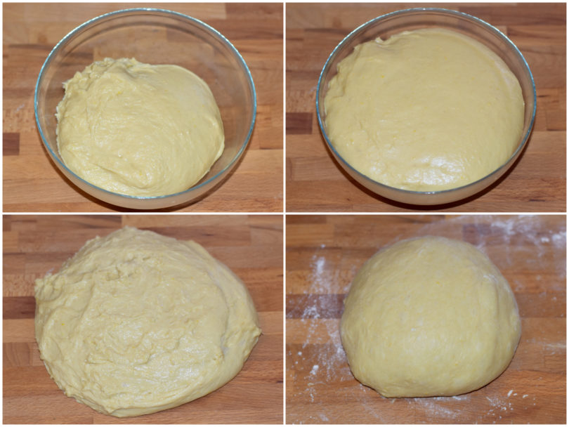 Una volta ben lievitato, sgonfiatelo con le mani e lavoratelo brevemente, dandogli infine una forma tondeggiante.