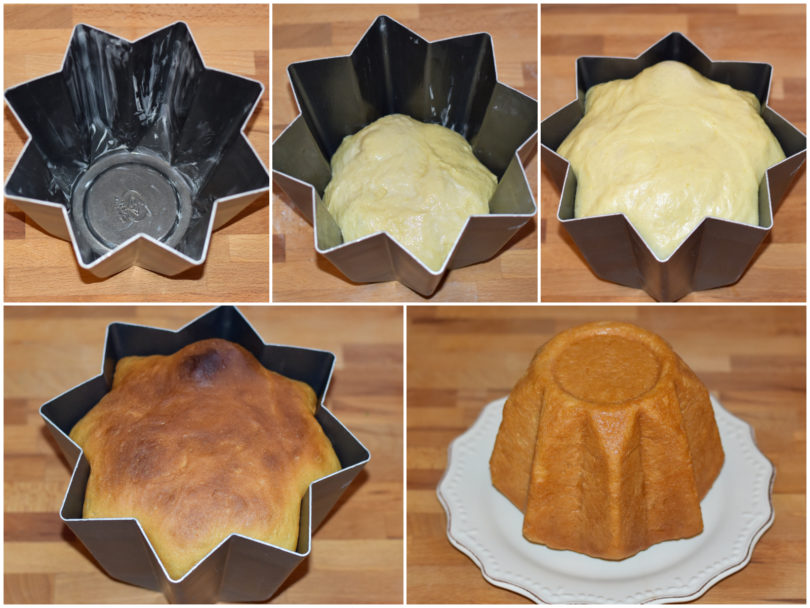 Disponete il pandoro, con la chiusura rivolta verso il fondo, nello stampo ben imburrato, spennellate con latte vegetale e lasciate lievitare nuovamente fino al raddoppio (dovrà arrivare quasi al bordo dello stampo).