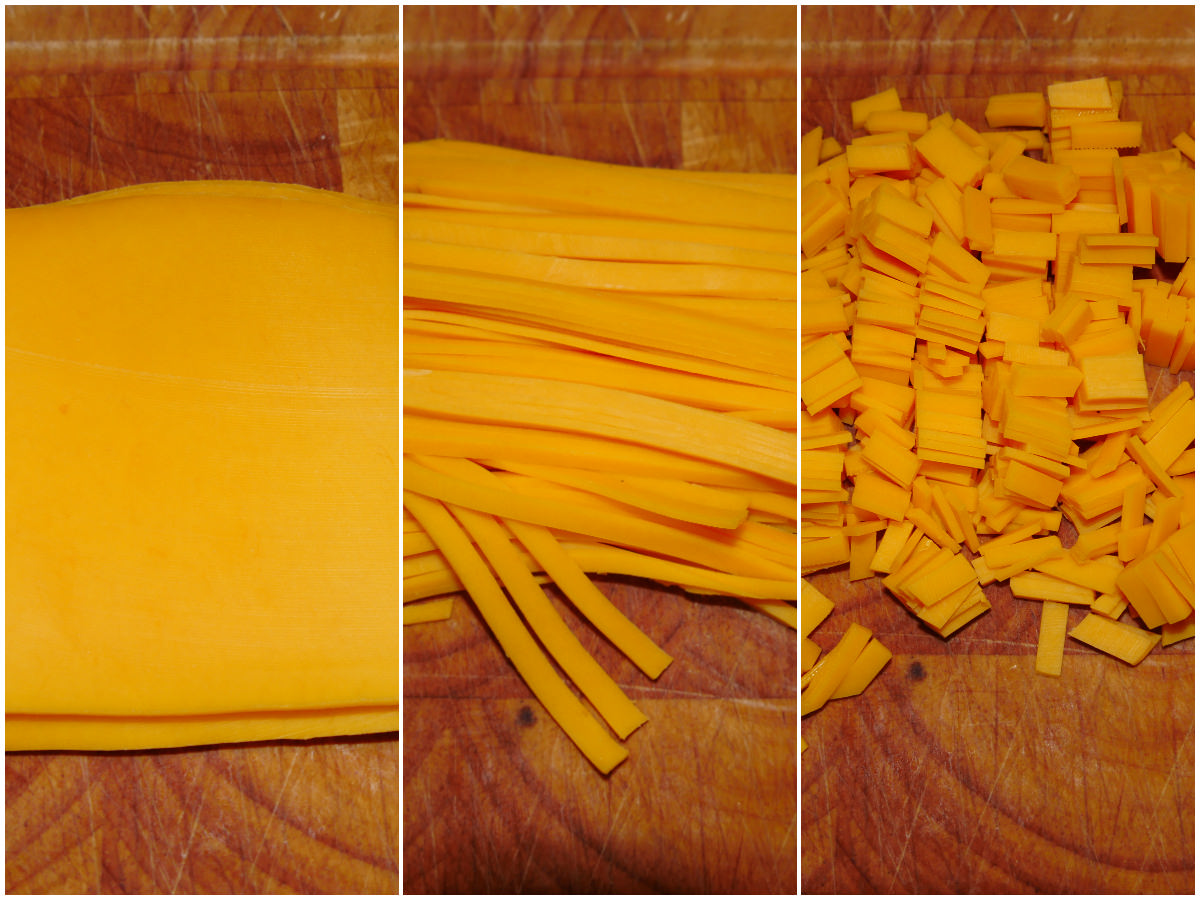 Innanzitutto tagliate il cheddar in piccoli dadini.