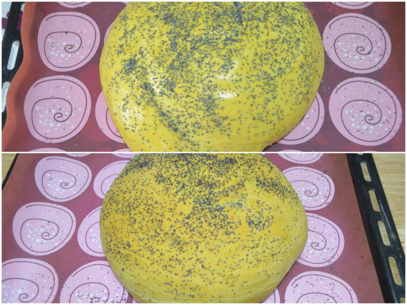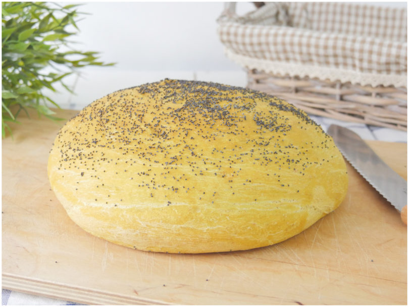Preriscaldate il forno a 220°C, spennellate il pane con acqua o olio, cospargetelo di semi di papavero e infornate. Dopo i primi 15 minuti abbassate la temperatura a 180°C e cuocete ancora per 30 minuti circa.