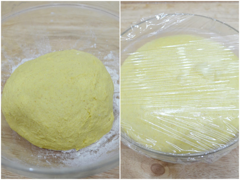 Coprite la ciotola con pellicola trasparente non a contatto o un canovaccio pulito e lasciate lievitare per circa 2 ore o fino al raddoppio del volume.