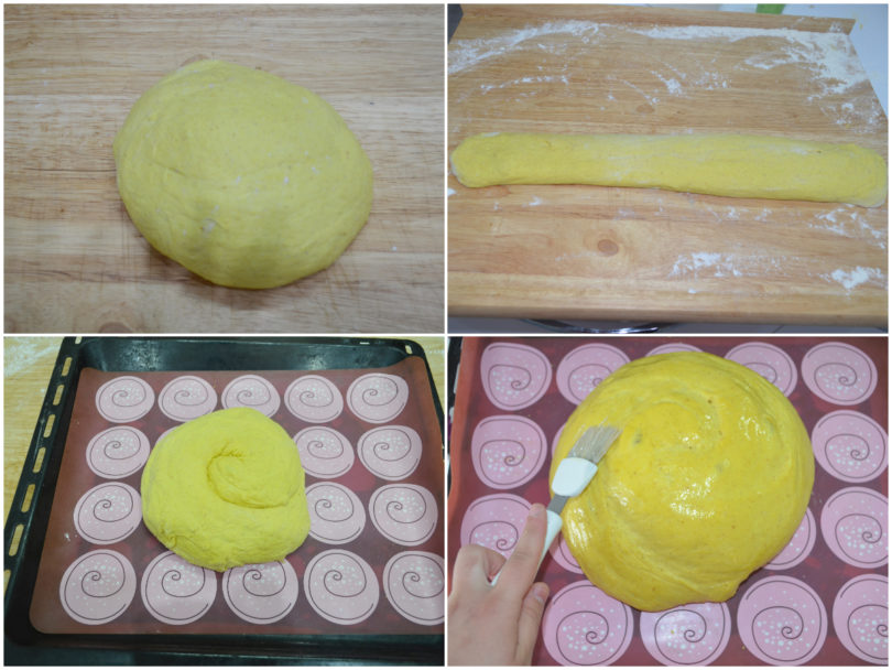 Spostate l'impasto su una spianatoia leggermente infarinata, sgonfiatelo con le mani, lavoratelo brevemente, create una forma allungata e arrotolatela a creare una spirale.