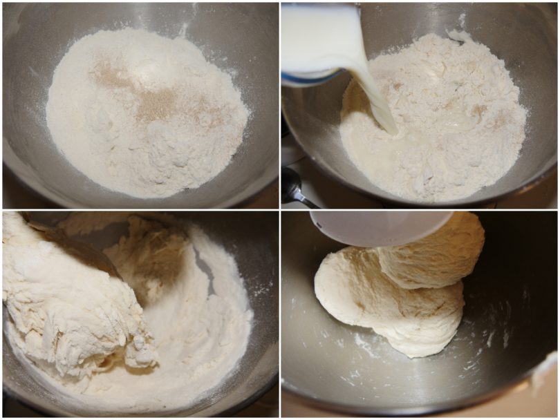 Disporre la farina a fontana e versare l'acqua a temperatura ambiente insieme al latte tiepido con dentro disciolto il lievito.