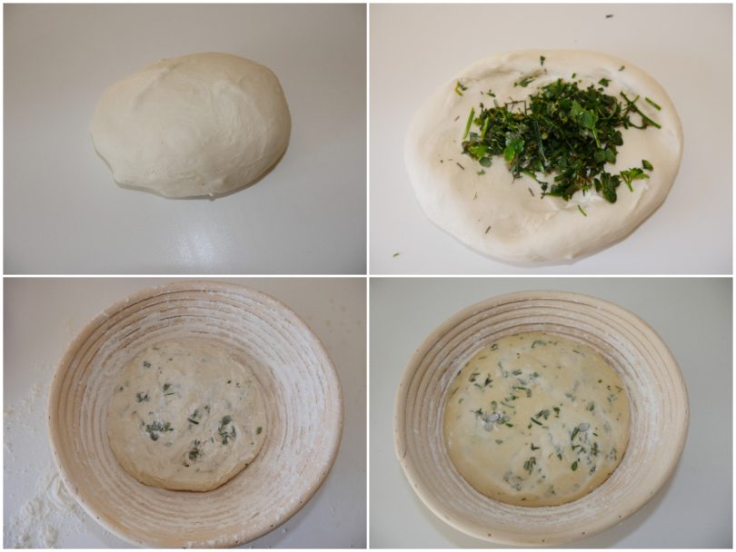 Passate ora l'impasto su un piano, formate una pagnotta e fate riposare 30 minuti al coperto. Poi tritate delle erbe fresche e aggiungetele all'impasto.
