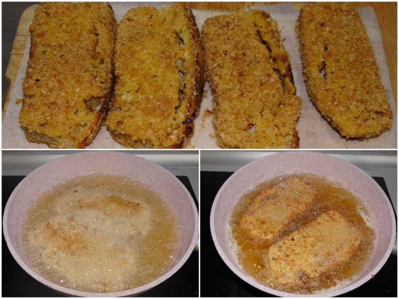Fate scaldare l'olio in una padella, quindi friggete il pane impanato, girandolo per farlo dorare in maniera uniforme.