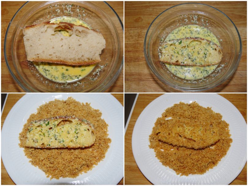 Imbevete le fette di pane nel composto di uova, una per volta, quindi impanatele per bene nel pangrattato.