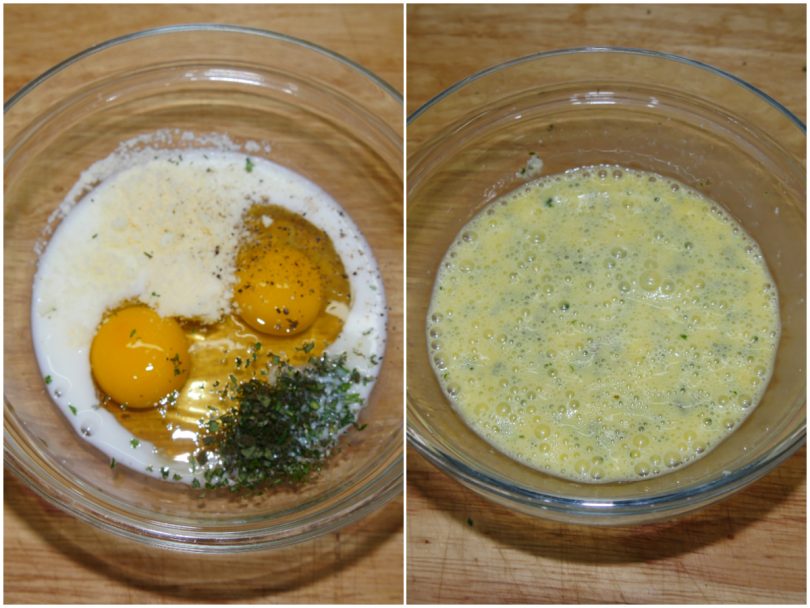 In una ciotola, mescolate uova, latte, parmigiano, prezzemolo tritato, sale e pepe fino ad ottenere un composto omogeneo.