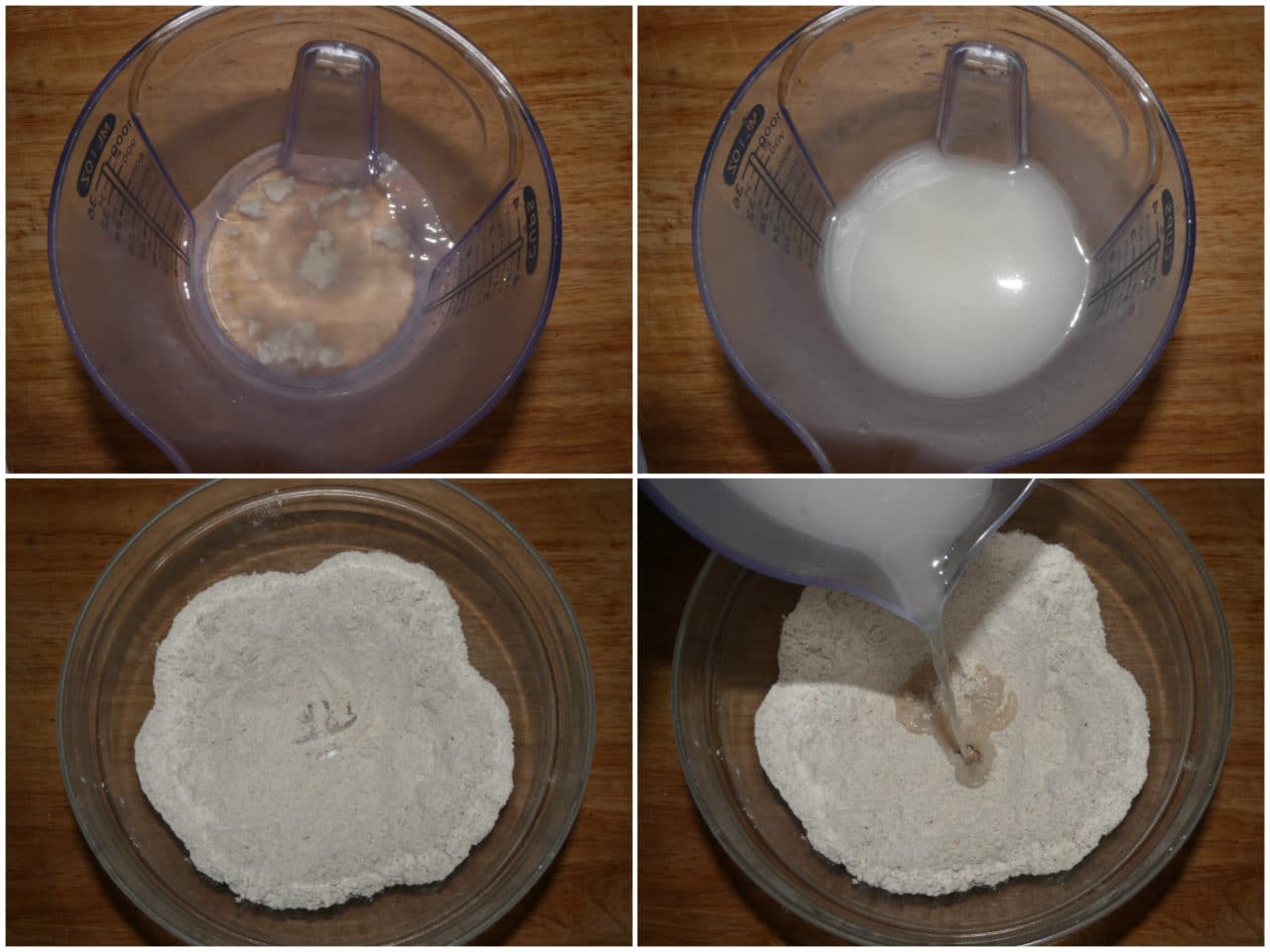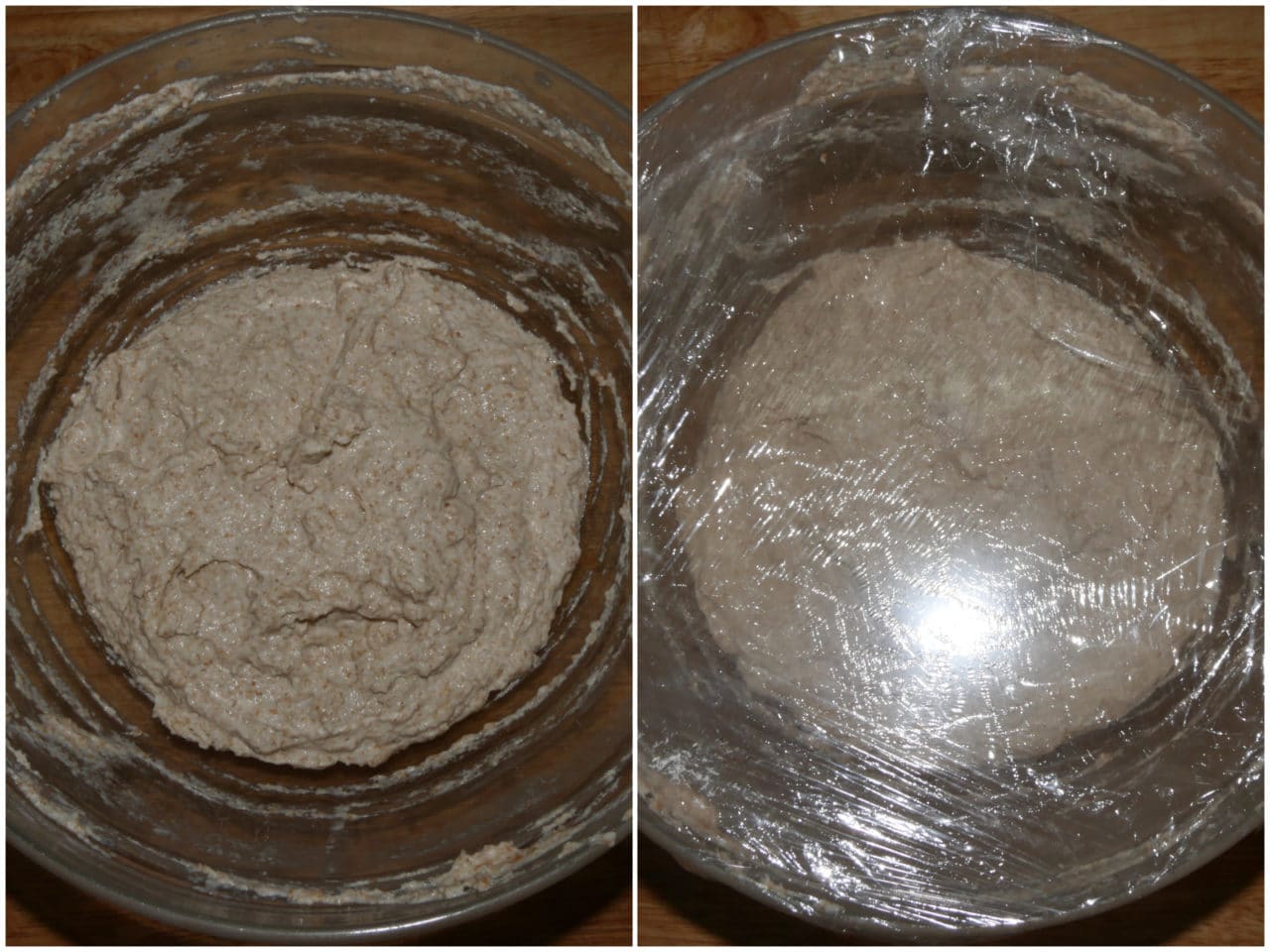 Innanzitutto preparate il poolish: sciogliete il lievito nell'acqua appena intiepidita, quindi versatelo in una ciotola in cui avrete già messo i 300 gr di farina, impastate velocemente, coprite con pellicola e lasciate lievitare per almeno 2 ore in un luogo caldo.