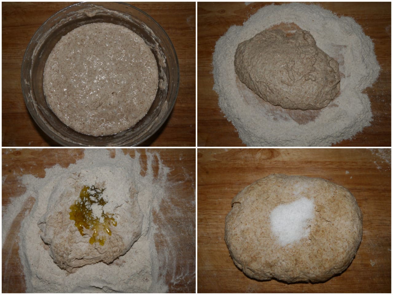 Preparate quindi l'impasto vero e proprio: versate il poolish sulla farina restante, aggiungete sale e olio e impastate fino ad ottenere un panetto omogeneo.